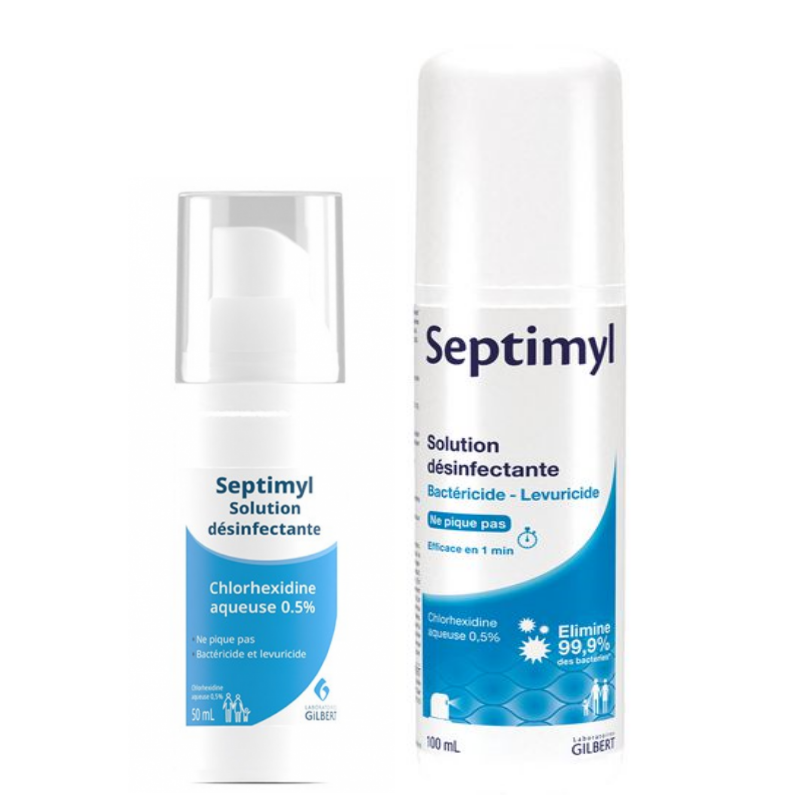 Pour une action désinfectante de la peau saine. La solution désinfectante Septimyl ne pique pas et élimine 99.9 % des bactéries. Activité bactéricide et levuricide. Disponible en 2 contenants: Spray de 50 ml ou Spray de 100 ml vendus à l'unité
