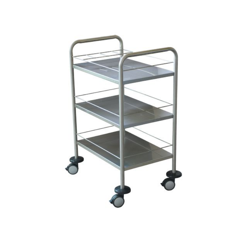 Guéridon médical en acier inoxydable avec 3 plateaux sécurisés par galeries, monté sur roulettes dont 2 avec freins. Idéal pour les environnements médicaux et professionnels.