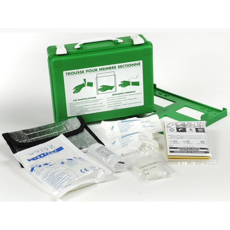 Cette trousse de secours comprend le nécessaire indispensable à la sauvegarde d'une main, d'un doigt ou d'un pied sectionné. Elle est livrée avec un support mural. Les manipulations et les conseils d'utilisation de la trousse sont affichés sur la face avant de celle-ci. Pansement compressif, pochettes de froid, gants, couverture de survie etc...