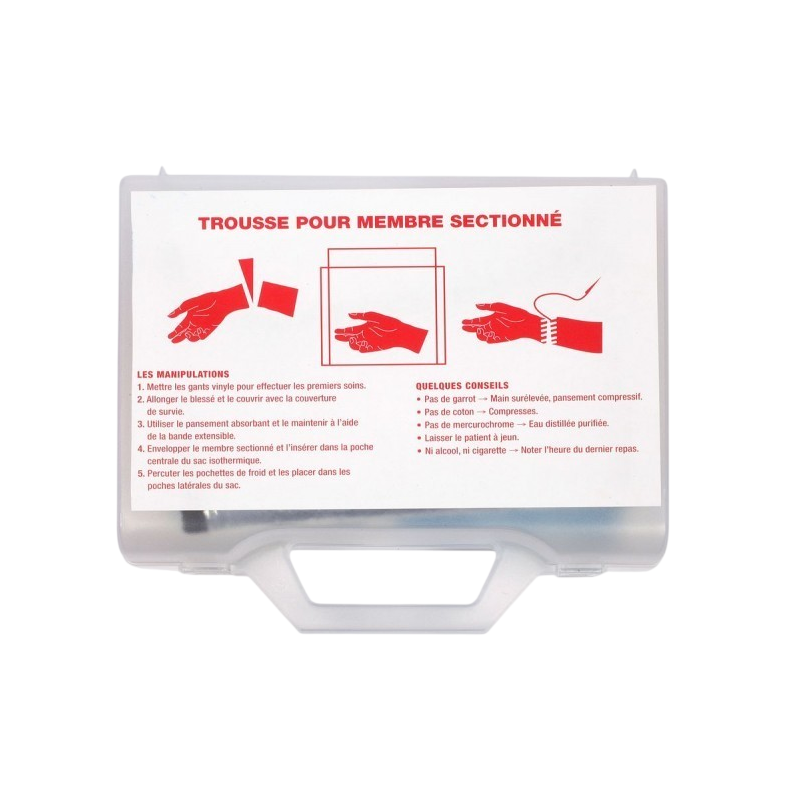 Cette trousse de secours comprend le nécessaire indispensable à la sauvegarde d'une main, d'un doigt ou d'un pied sectionné. Les manipulations et les conseils d'utilisation de la trousse sont affichés sur la face avant de celle-ci. Pansement compressif, pochettes de froid, gants, couverture de survie etc...